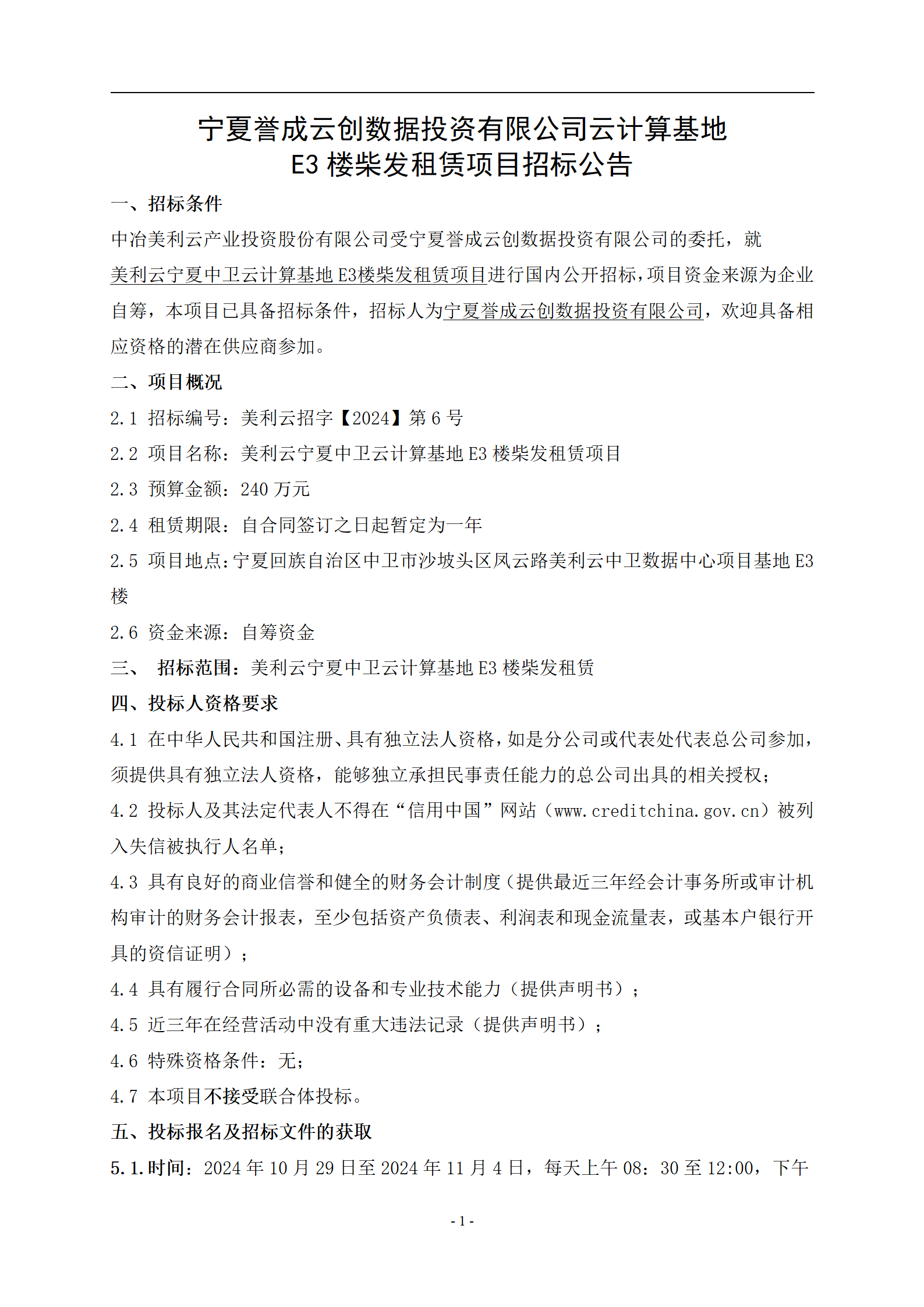 中冶美利云產(chǎn)業(yè)投資股份有限公司受寧夏譽(yù)成云創(chuàng)數(shù)據(jù)投資有限公司的委托,就美利云寧夏中衛(wèi)云計(jì)算基地E3樓柴發(fā)租賃項(xiàng)目進(jìn)行國內(nèi)公開招標(biāo),項(xiàng)目資金來源為企業(yè)自籌,本項(xiàng)目已具備招標(biāo)條件,招標(biāo)人為寧夏譽(yù)成云創(chuàng)數(shù)據(jù)投資有限公司,歡迎具備相應(yīng)資格的潛在供應(yīng)商參加。